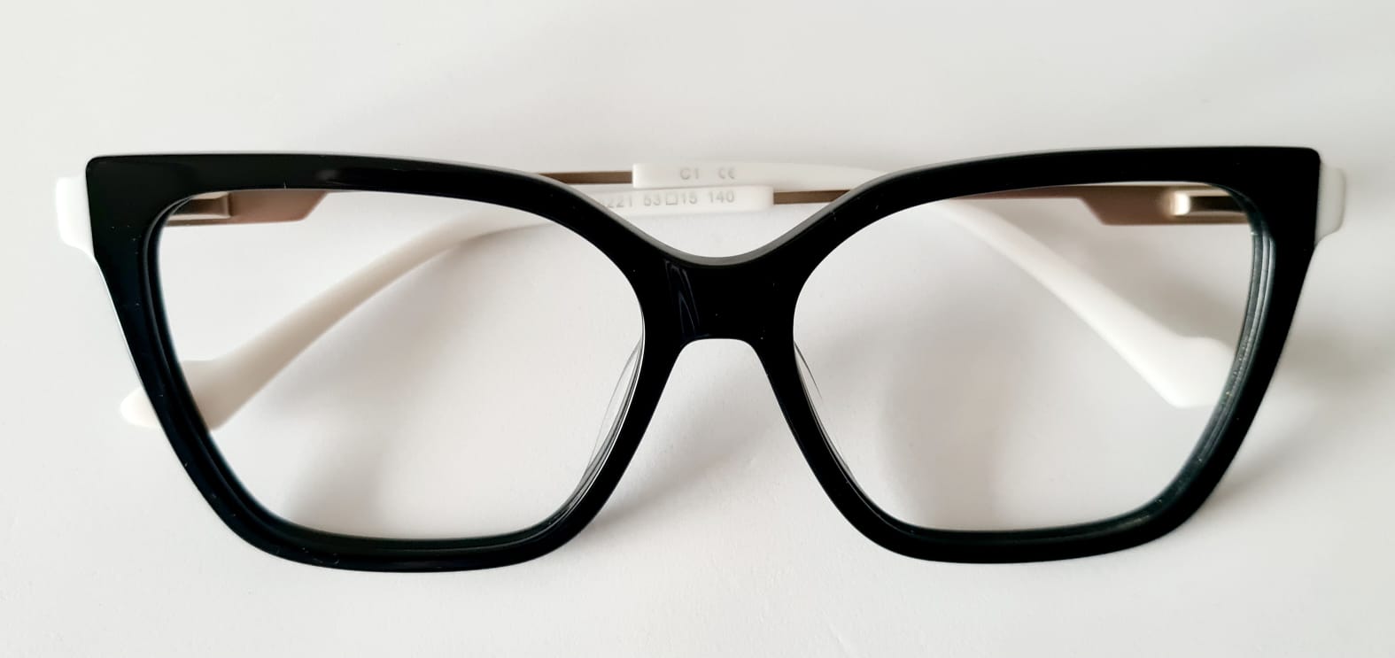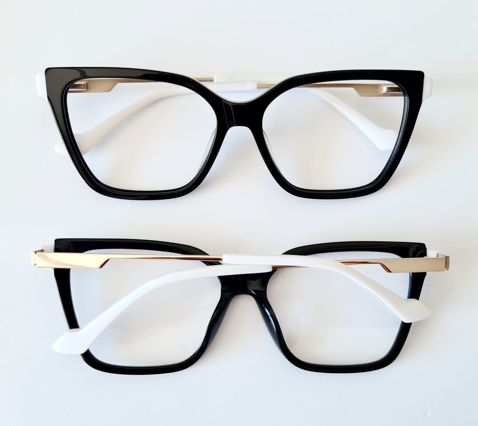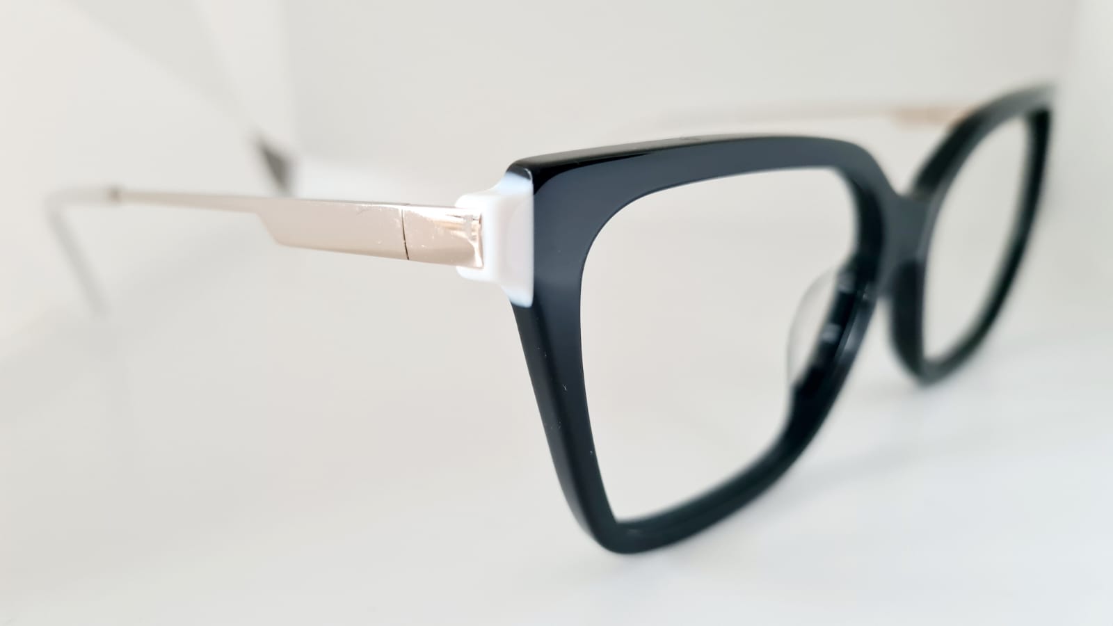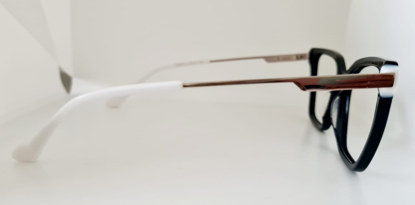 Com um design marcante e contemporâneo, essa armação no formato gatinho combina o clássico preto frontal com hastes brancas e detalhes metálicos dourados que elevam o visual. Um modelo ideal para quem busca elegância com um toque de originalidade. Perfeita para looks modernos e sofisticados.