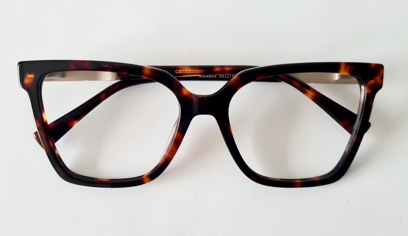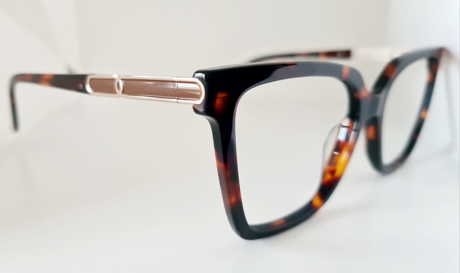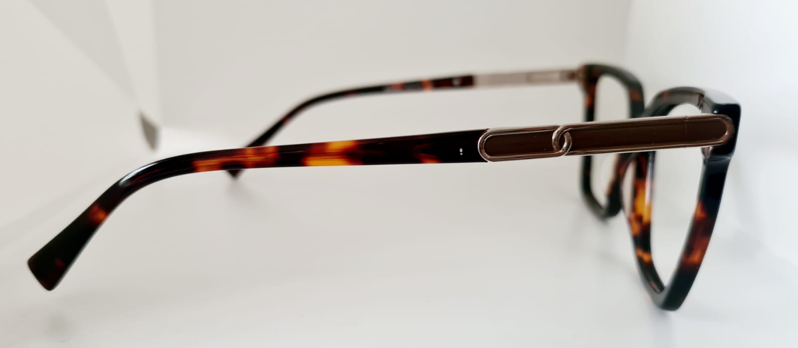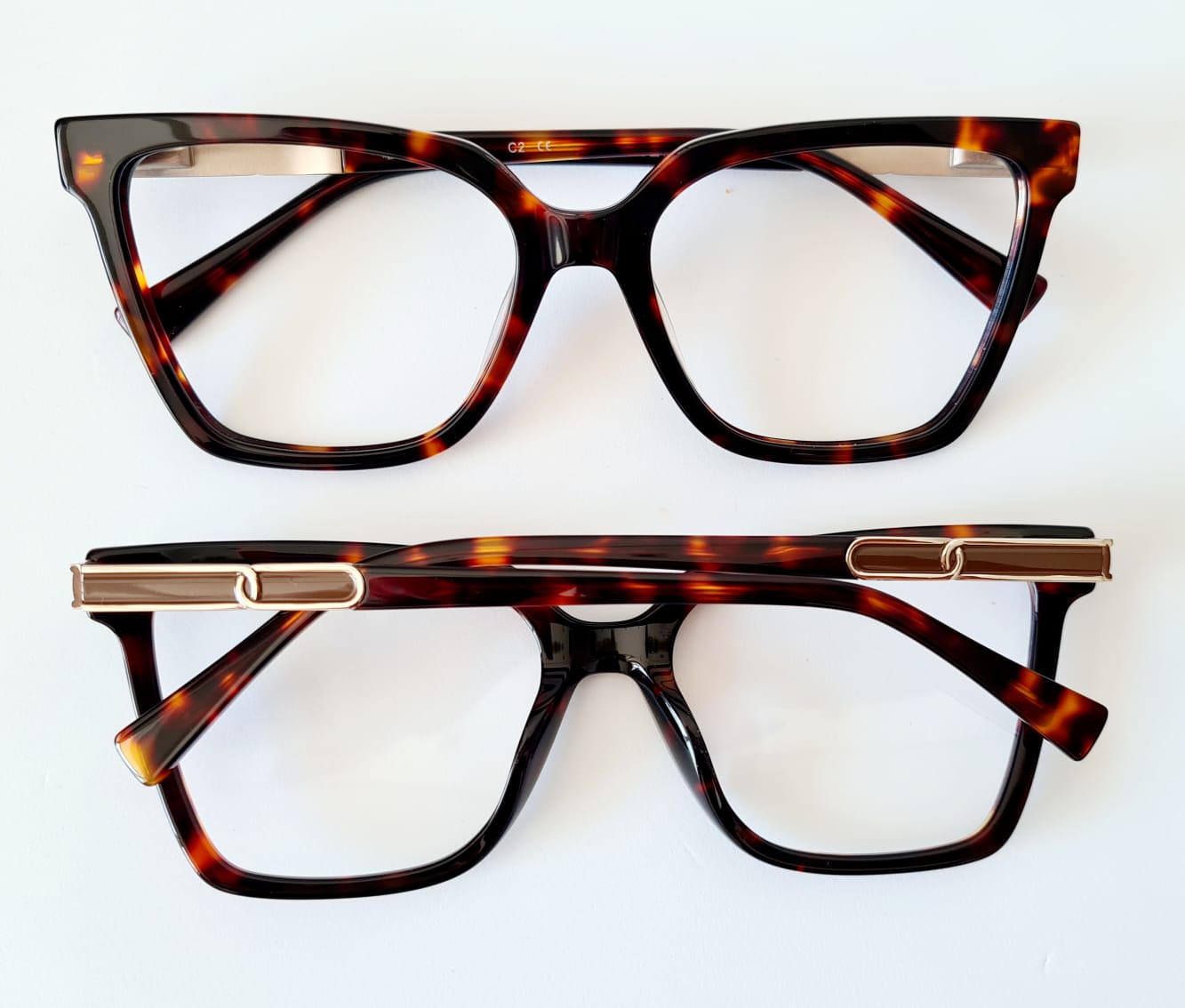 Para quem busca uma peça marcante e cheia de personalidade, esta armação no padrão tartaruga é a escolha ideal. Seu design geométrico combina com uma variedade de formatos de rosto, enquanto os detalhes metálicos dourados nas hastes trazem um toque sofisticado e moderno. Uma peça versátil, perfeita para o dia a dia ou para ocasiões especiais.